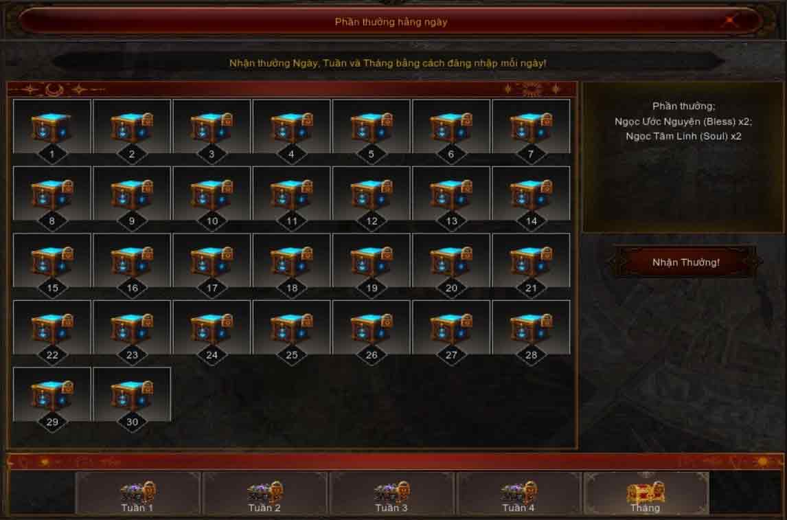 Phần thưởng hàng ngày – Người chơi nhận được phần thưởng mỗi ngày khi đăng nhập