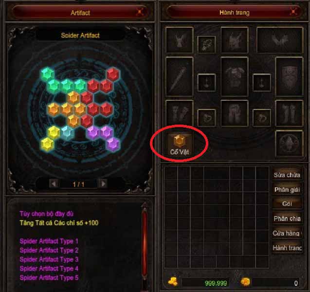 Nếu bạn lắp trống được tất cả các ô Cổ Vật thì sẽ được thêm tính năng + 100 điểm tất cả chỉ số cơ bản