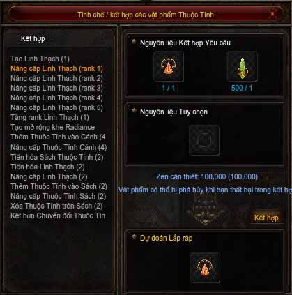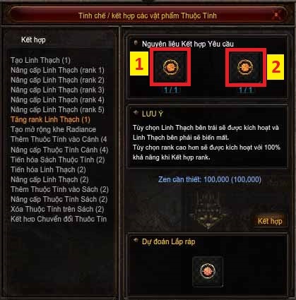 Nguyên liệu: 2 Linh Thạch cùng rank cấp độ +7 trở lên + zen
