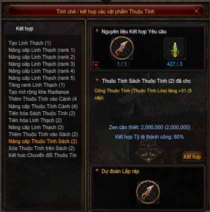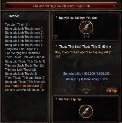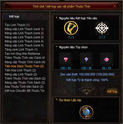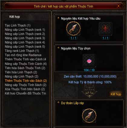 Nguyên liệu: Sách Thuộc Tính (2) + Linh Thạch (2) cấp 3 trở lên + Ngọc Sáng Tạo x10 + 10,000,000 zen