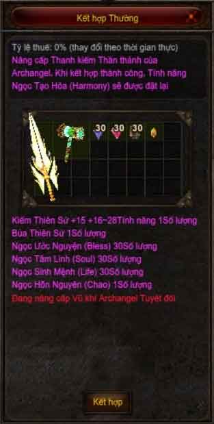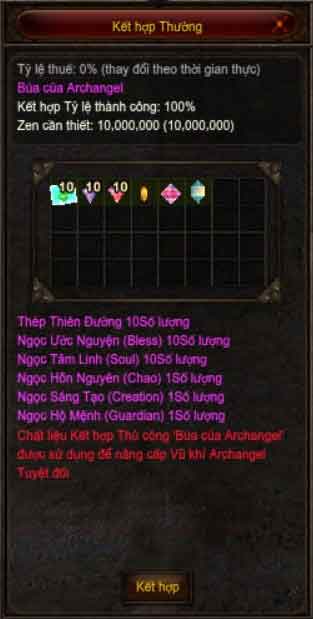 Thép Thiên Đường x10 + Ngọc Ước Nguyện x10 + Ngọc Tâm Linh x10 + Ngọc Hỗn Nguyên + Ngọc Sáng Tạo + Ngọc Hộ Mệnh với tỷ lệ 100% tạo ra Búa Thiên Sứ